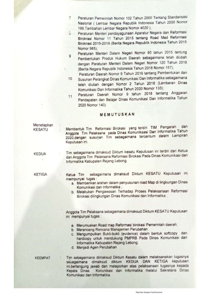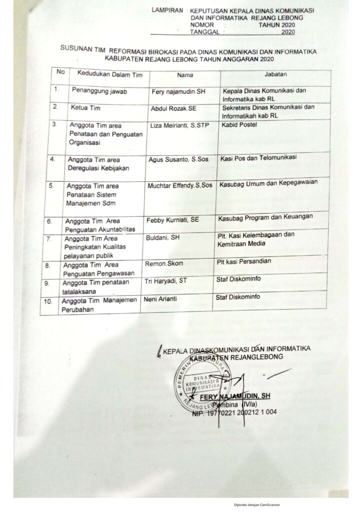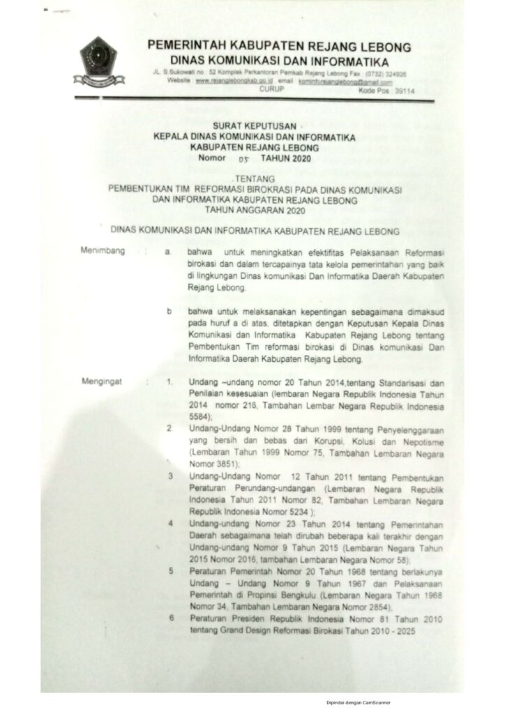 Pembentukan Tim Reformasi Birokrasi pada Dinas Komunikasi dan InformastikaKabupaten Rejang Lebong 2020