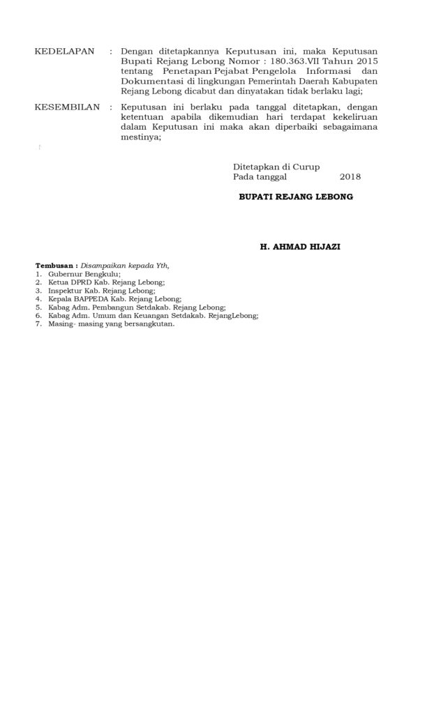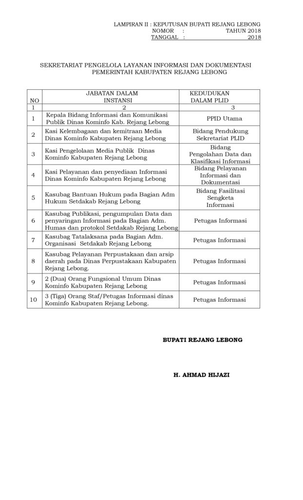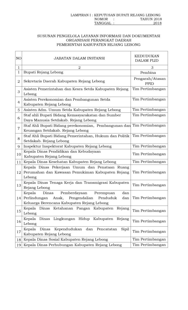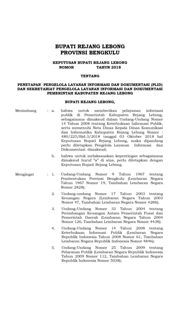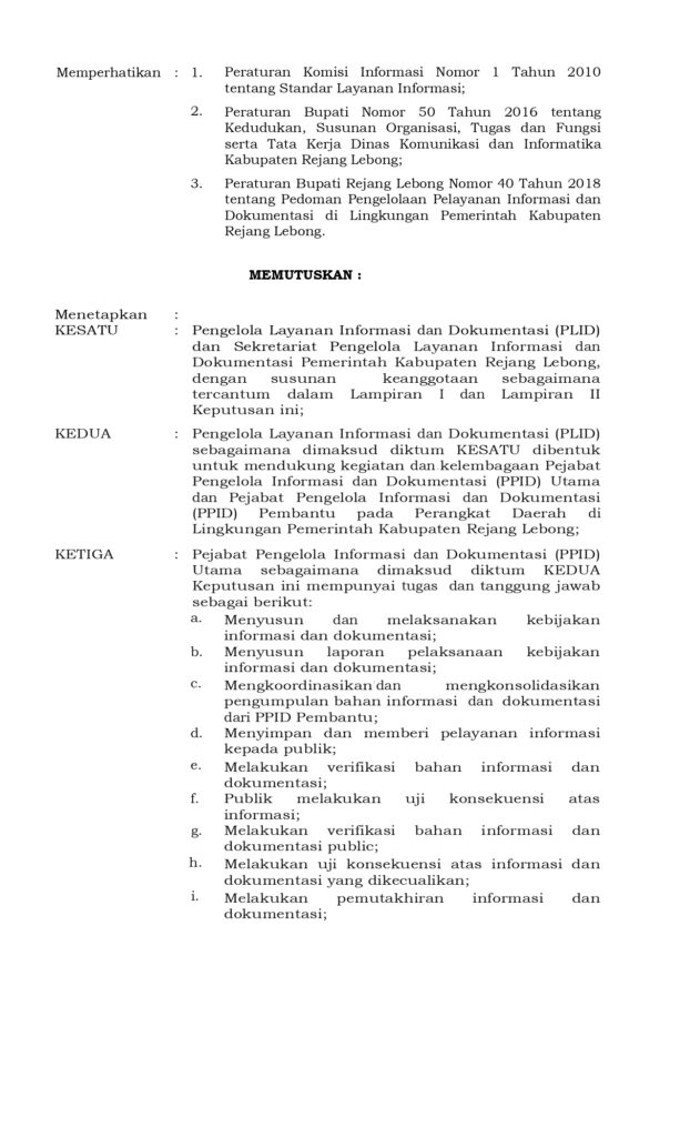 Penetapan Pengelola Layana Informasi dan Dokumentasi dan Sekretariat Pengelola Layanan Informasi dan Dokmentasi Pemerintah Kabupaten Rejang Lebong